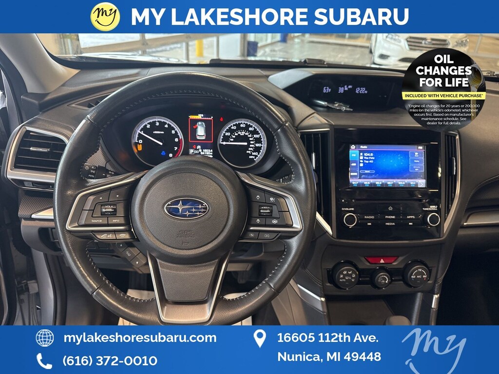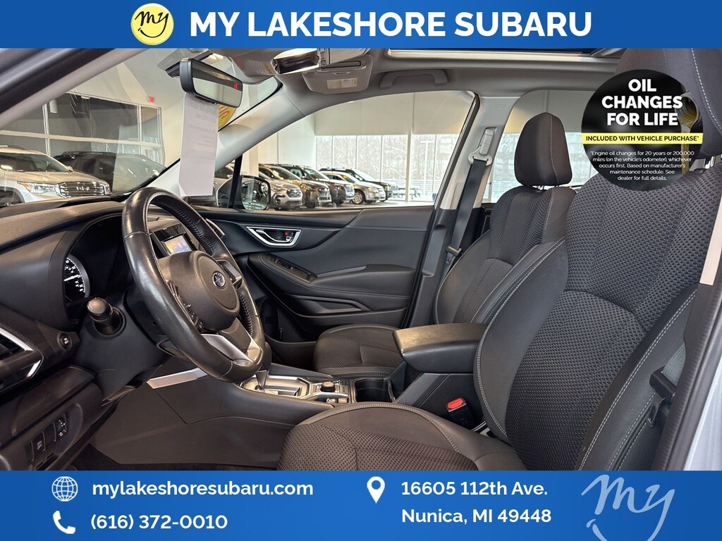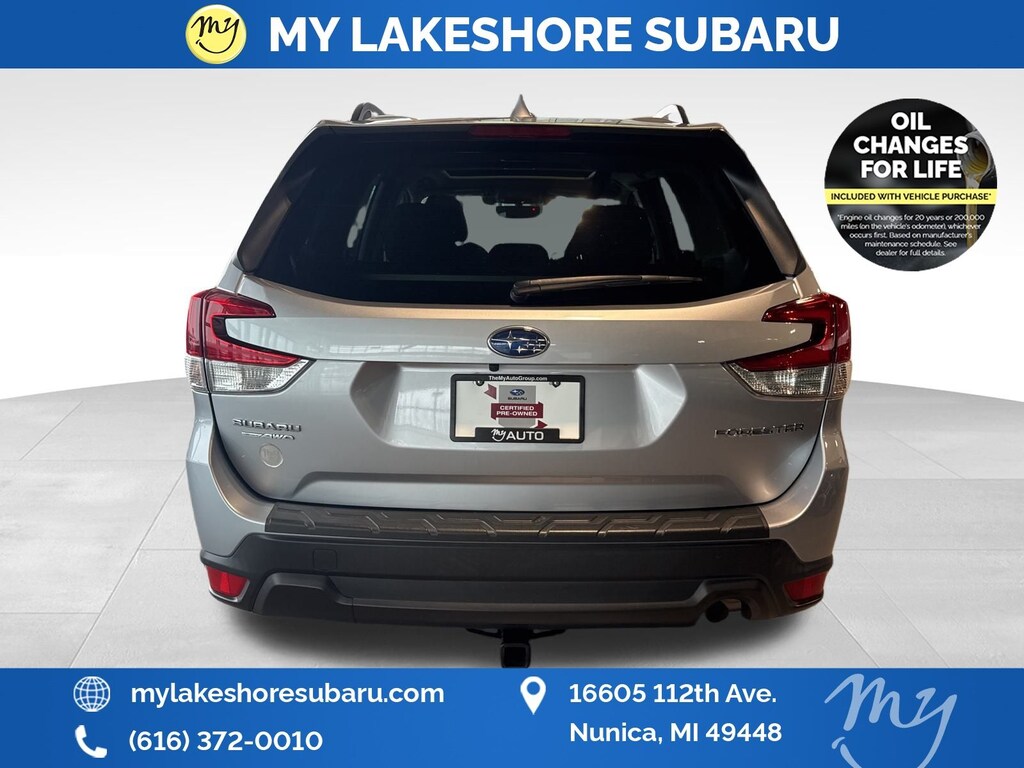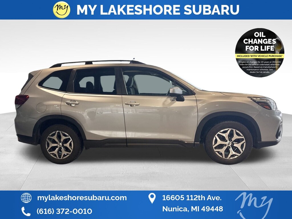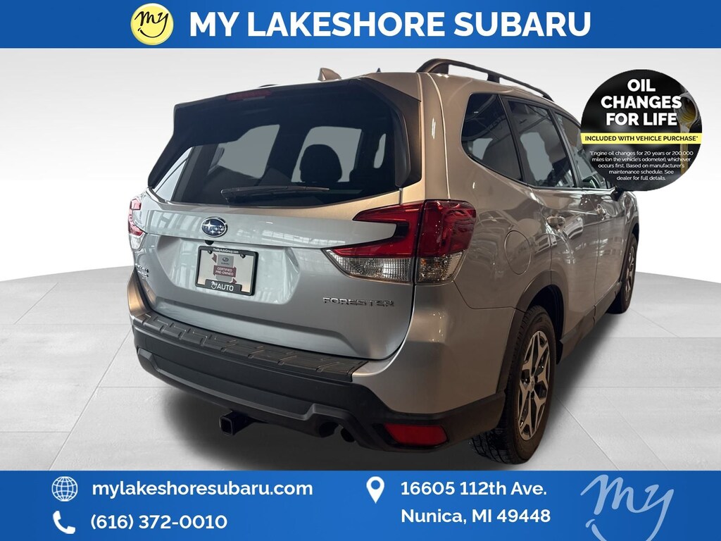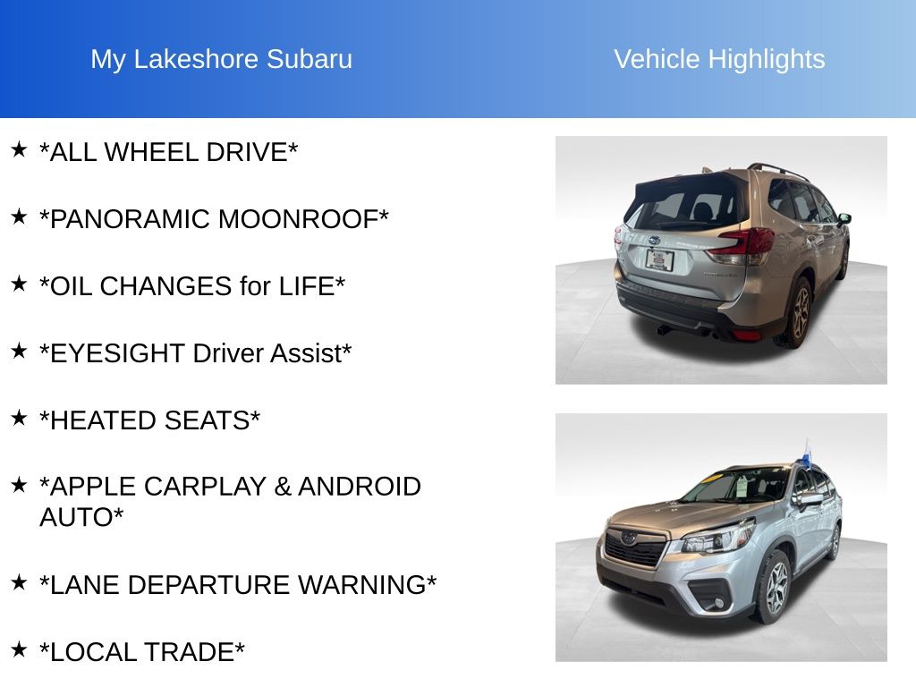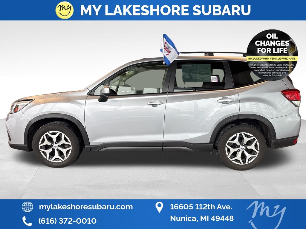 Forester Premium, Ice Silver Metallic, *ALL WHEEL DRIVE*, *APPLE CARPLAY & ANDROID AUTO*, *EYESIGHT Driver Assist*, *HEATED SEATS*, *LANE DEPARTURE WARNING*, *LOCAL TRADE*, *OIL CHANGES for LIFE*, *PANORAMIC MOONROOF*. Certified. Ice Silver Metallic 2021 Subaru Forester Premium AWD Lineartronic CVT 2.5L 4-Cylinder DOHC 16V VVT