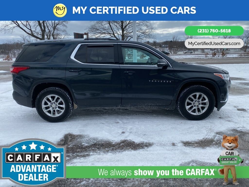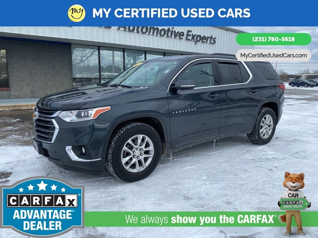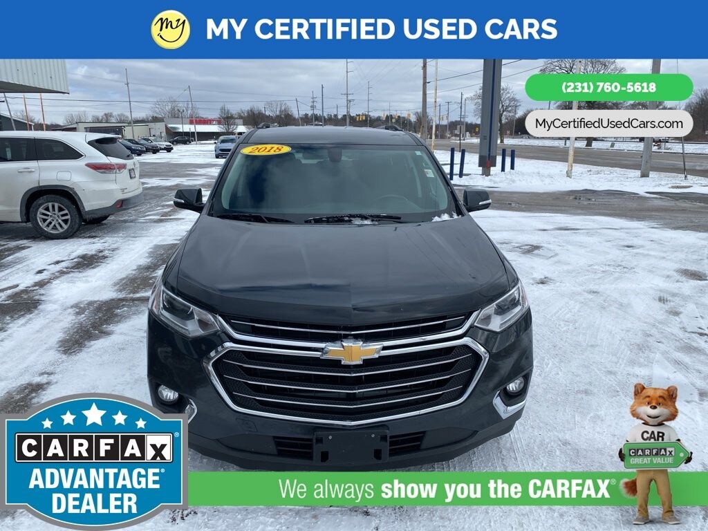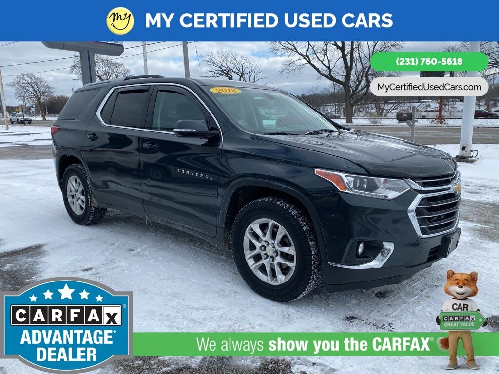 AWD. MY Certified Used Cars of Muskegon is your #1 choice in Michigan to get the BEST PRICE on used vehicles and BEST value for your trade. The MY Certified Used Cars team is ready to provide you with a world-class experience, ensuring that you find the perfect vehicle that fits all your needs. Every vehicle has been through a full safety inspection completed by certified technicians and fully detailed. We sell many makes and models, Pre-Owned Vehicles with years from 2025-2024-2023-2022-2021-2020-2019-2018-2017-2016-2015-2014-2013-2012-2011-2010-2009-2008-2007 and all makes Audi, BMW, Chevrolet, Toyota, Volkswagen, Kia, Hyundai, Mercedes, Dodge, Chrysler, Jeep, Ram, Lincoln, Honda, Subaru, and many models like Bronco, Bronco Sport, Edge, Escapes, Expedition, Explorer, Fusions, Focus, Flex, F-150 Series, F-250, F-350, Super Duty Diesel Trucks, Maverick, Mustang MACH-E, Mustang, Ranger, Transit, Wrangler, Grand Cherokee, Grand Cherokee L, Wagoneer, Gladiator, Grand Caravan, RAM, RAM HEMI, and more. Take advantage of our VIP experience by calling 231-760-5618 to schedule a test drive. Read our customer reviews at www.mycertifiedusedcars.com/testimonials or view our entire selection of preowned vehicles at www.mycertifiedusedcars.com, or stop by today, located at 3692 Airline Rd. Muskegon, MI 49444. Graphite Metallic 2018 Chevrolet Traverse LT Cloth w/1LT AWD 9-Speed Automatic 3.6L V6 SIDI VVT