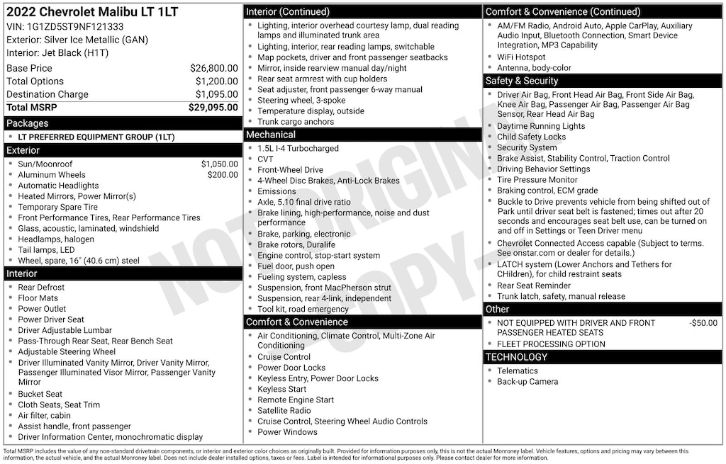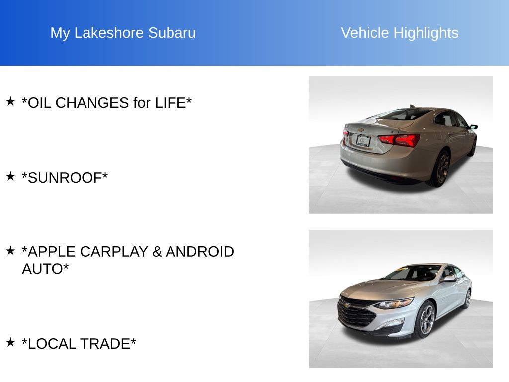 Malibu LT, Silver Ice Metallic, *APPLE CARPLAY & ANDROID AUTO*, *LOCAL TRADE*, *OIL CHANGES for LIFE*, *SUNROOF*. Silver Ice Metallic 2022 Chevrolet Malibu LT FWD CVT 1.5L DOHC