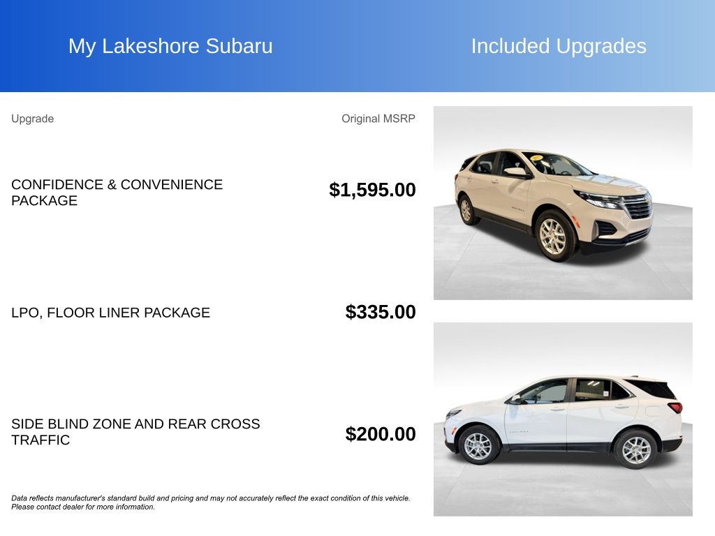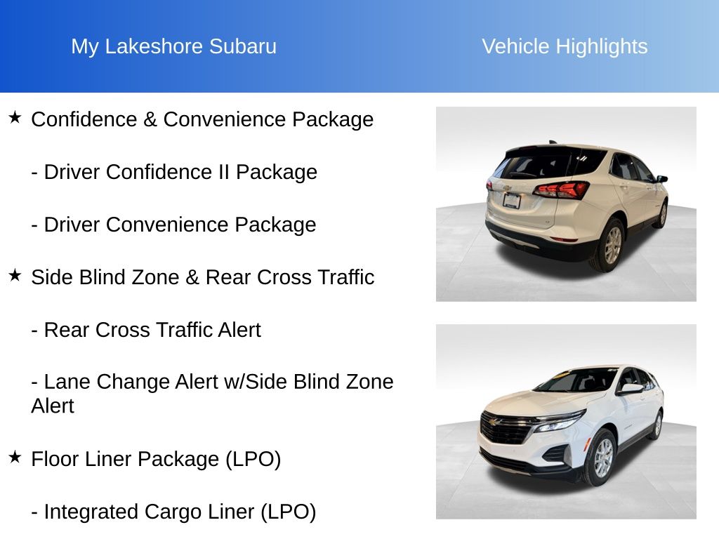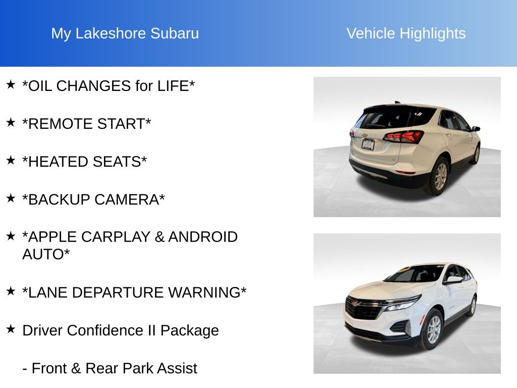 Equinox LT, Summit White, *APPLE CARPLAY & ANDROID AUTO*, *BACKUP CAMERA*, *HEATED SEATS*, *LANE DEPARTURE WARNING*, *OIL CHANGES for LIFE*, *REMOTE START*, All-Weather Floor Liners (LPO), Confidence & Convenience Package, Driver Confidence II Package, Driver Convenience Package, Dual-Zone Automatic Climate Control, Floor Liner Package (LPO), Front & Rear Park Assist, Heated Driver & Front Passenger Seats, Integrated Cargo Liner (LPO), Lane Change Alert w/Side Blind Zone Alert, Rear Cross Traffic Alert, Rear Power Liftgate, Remote Start, Side Blind Zone & Rear Cross Traffic, Wrapped Steering Wheel. Summit White 2023 Chevrolet Equinox LT FWD 6-Speed Automatic Electronic with Overdrive 1.5L DOHC