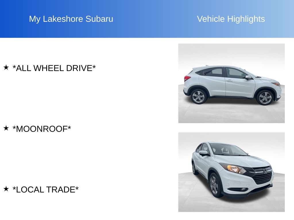 HR-V EX, White Orchid Pearl, *ALL WHEEL DRIVE*, *LOCAL TRADE*, *MOONROOF*. White Orchid Pearl 2016 Honda HR-V EX AWD CVT 1.8L I4 SOHC 16V i-VTEC