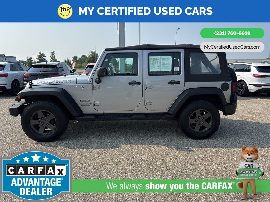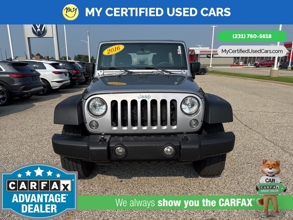 MY Certified Used Cars of Muskegon is your #1 choice in Michigan to get the BEST PRICE on used vehicles and BEST value for your trade. The MY Certified Used Cars team is ready to provide you with a world-class experience, ensuring that you find the perfect vehicle that fits all your needs. Every vehicle has been through a full safety inspection completed by certified technicians and fully detailed. We sell many makes and models, Pre-Owned Vehicles with years from 2025-2024-2023-2022-2021-2020-2019-2018-2017-2016-2015-2014-2013-2012-2011-2010-2009-2008-2007 and all makes Audi, BMW, Chevrolet, Toyota, Volkswagen, Kia, Hyundai, Mercedes, Dodge, Chrysler, Jeep, Ram, Lincoln, Honda, Subaru, and many models like Bronco, Bronco Sport, Edge, Escapes, Expedition, Explorer, Fusions, Focus, Flex, F-150 Series, F-250, F-350, Super Duty Diesel Trucks, Maverick, Mustang MACH-E, Mustang, Ranger, Transit, Wrangler, Grand Cherokee, Grand Cherokee L, Wagoneer, Gladiator, Grand Caravan, RAM, RAM HEMI, and more. Take advantage of our VIP experience by calling 231-760-5618 to schedule a test drive. Read our customer reviews at www.mycertifiedusedcars.com/testimonials or view our entire selection of preowned vehicles at www.mycertifiedusedcars.com, or stop by today, located at 3692 Airline Rd. Muskegon, MI 49444. Billet Silver Metallic Clearcoat 2016 Jeep Wrangler Unlimited Sport 4WD 5-Speed Automatic 3.6L V6 24V VVT Clean CARFAX.