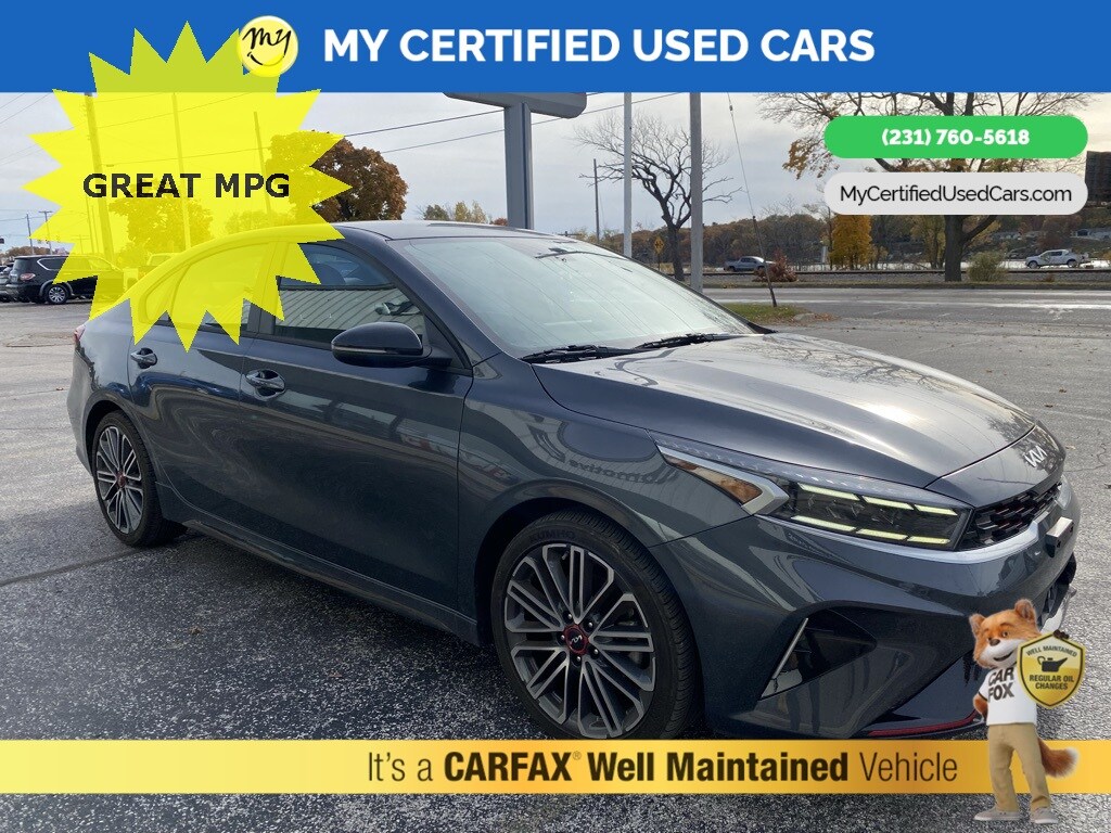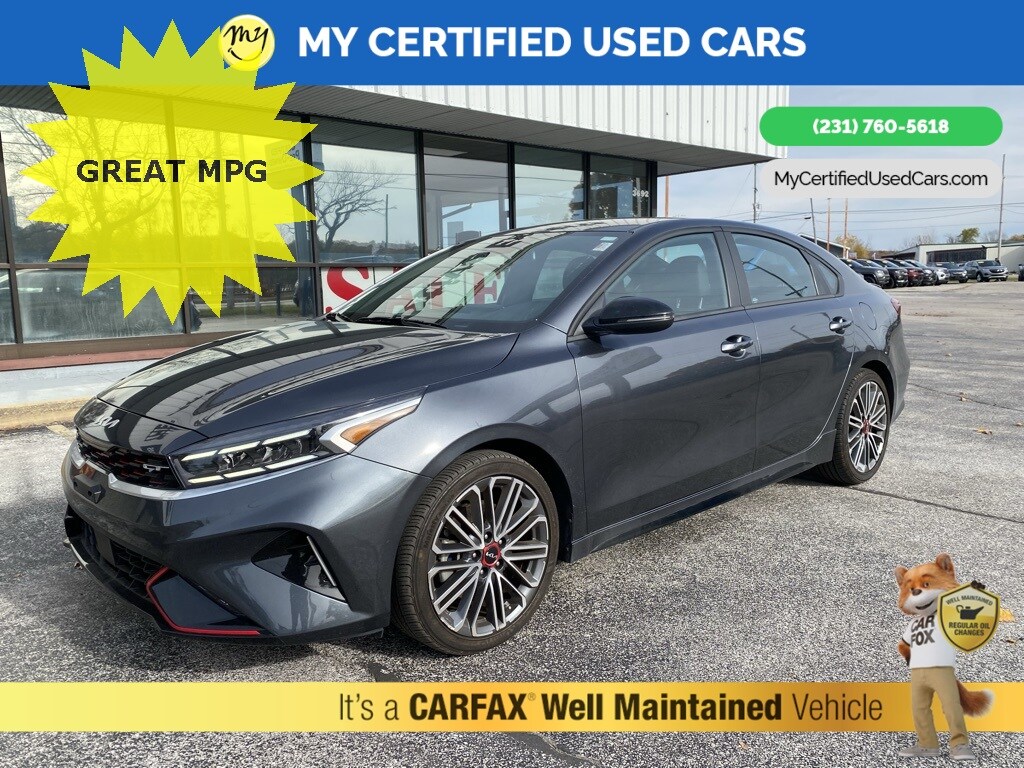 *SUPER BUY*, *VERY CLEAN* ***2023 KIA FORTE GT*** *FULLY SERVICED* **GT LINE** *NAVIGATION SYSTEM* *APPLE CARPLAY & ANDROID AUTO*, *BLIND SPOT MONITORING SYSTEM*, *HANDSFREE BLUETOOTH*, *REARVIEW CAMERA*, **PARKING SENSORS** Auto High-beam Headlights, Exterior Parking Camera Rear. MY Certified Used Cars of Muskegon is your #1 choice in Michigan to get the BEST PRICE on used vehicles and BEST value for your trade. The MY Certified Used Cars team is ready to provide you with a world-class experience, ensuring that you find the perfect vehicle that fits all your needs. Every vehicle has been through a full safety inspection completed by certified technicians and fully detailed. We sell many makes and models, Pre-Owned Vehicles with years from 2025-2024-2023-2022-2021-2020-2019-2018-2017-2016-2015-2014-2013-2012-2011-2010-2009-2008-2007 and all makes Audi, BMW, Chevrolet, Toyota, Volkswagen, Kia, Hyundai, Mercedes, Dodge, Chrysler, Jeep, Ram, Lincoln, Honda, Subaru, and many models like Bronco, Bronco Sport, Edge, Escapes, Expedition, Explorer, Fusions, Focus, Flex, F-150 Series, F-250, F-350, Super Duty Diesel Trucks, Maverick, Mustang MACH-E, Mustang, Ranger, Transit, Wrangler, Grand Cherokee, Grand Cherokee L, Wagoneer, Gladiator, Grand Caravan, RAM, RAM HEMI, and more. Take advantage of our VIP experience by calling 231-760-5618 to schedule a test drive. Read our customer reviews at www.mycertifiedusedcars.com/testimonials or view our entire selection of preowned vehicles at www.mycertifiedusedcars.com, or stop by today, located at 3692 Airline Rd. Muskegon, MI 49444. Gravity Gray 2023 Kia Forte GT FWD 7-Speed Automatic 1.6L I4 Turbo