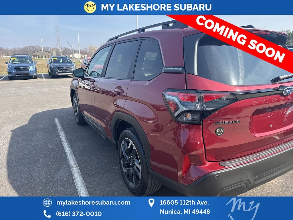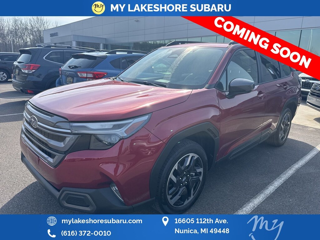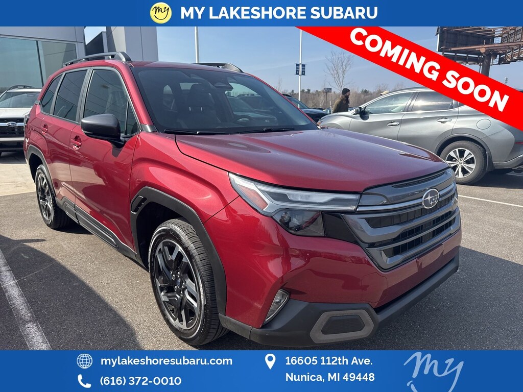Forester Limited, Crimson Red Pearl, *ALL WHEEL DRIVE*, *APPLE CARPLAY & ANDROID AUTO*, *BACKUP CAMERA*, *EYESIGHT Driver Assist*, *HEATED STEERING WHEEL*, *LANE DEPARTURE WARNING*, *LEATHER HEATED POWER SEATS*, *LOCAL TRADE*, *OIL CHANGES for LIFE*, *PANORAMIC MOONROOF*, *PREMIUM SOUND*, Auto-Dimming Exterior Mirror w/Approach Light, Auto-Dimming Mirror w/Compass & HomeLink, Cargo Tray, harman/kardon Audio & Navigation & RAB, Popular Package #1, Radio: Subaru 11.6" Multimedia Navigation System, Rear Bumper Cover, Reverse Automatic Braking (RAB) System. Crimson Red Pearl 2025 Subaru Forester Limited AWD Lineartronic CVT 2.5L 4-Cylinder DOHC 16V