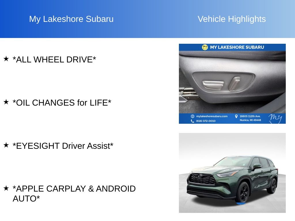 Highlander L, AWD, Cypress, *ALL WHEEL DRIVE*, *APPLE CARPLAY & ANDROID AUTO*, *EYESIGHT Driver Assist*, *OIL CHANGES for LIFE*. Cypress 2023 Toyota Highlander L AWD 8-Speed Automatic 2.4L I4 PDI Turbocharged DOHC 16V LEV3-SULEV30 265hp